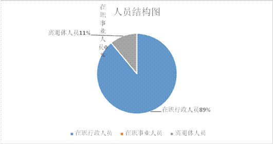 截止2018年底,本部门人员总编制111名,其中行政编制111名,事业编制0名;实有在职人员333人,正式职工177人,协警人员150人,其他基础服务工作临聘人员6人,离退休人员35人,遗属人员8人。(附饼状图)