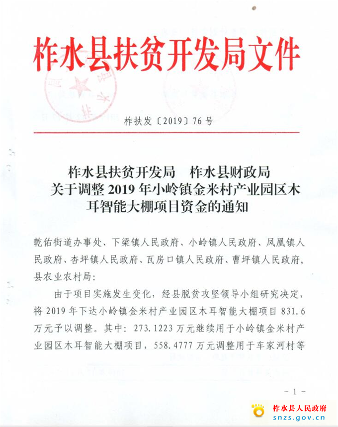 关于调整2019年小岭镇金米村产业园区木耳智能大棚项目资金的通知