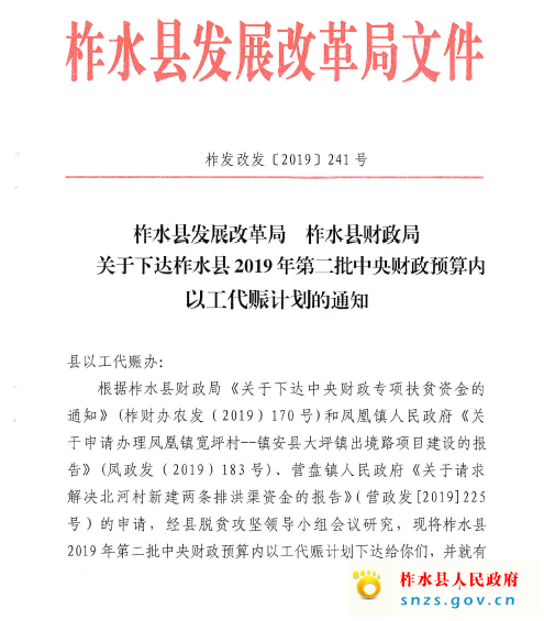 关于下达柞水县2019年第二批中央财政预算内以工代赈计划的通知