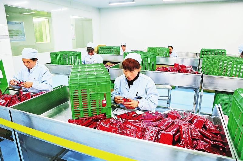 1月19日,在柞水县盘龙药业的车间里,工人正对生产出来的药品进行包装。据了解,盘龙药业投资7.95亿元的延链项目建成后,年产值将达到50亿元以上,可新增就业岗位500多个,带动当地7500多人稳定增收。(记者 谢非摄)