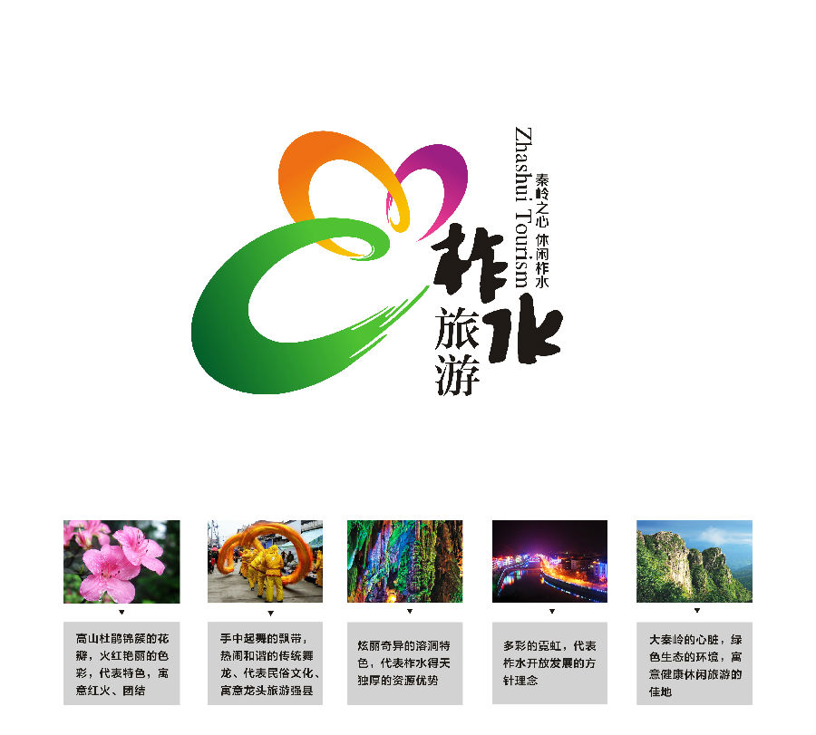代表生态自然的绿色,多层次展现,不仅有视角美感,还阐释出柞水生态旅游的多层次涵义,包括环境生态、自然资源、人文健康等一系列绿色理念。蓝色水系遍布环绕,润泽城乡、惠及民众。特色景区:溶洞奇观,五彩斑斓;凤凰古镇,民俗文化,异彩呈现。标志丰富的色彩运用,给人以美的享受和难以忘记的视角冲击力,将标志设计中难度很大的全彩运用的巧妙而自然。